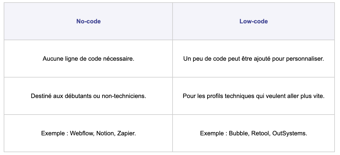👉 En résumé : le no-code est 100 % visuel, tandis que le low-code permet plus de flexibilité pour ceux qui ont quelques bases en développement.
