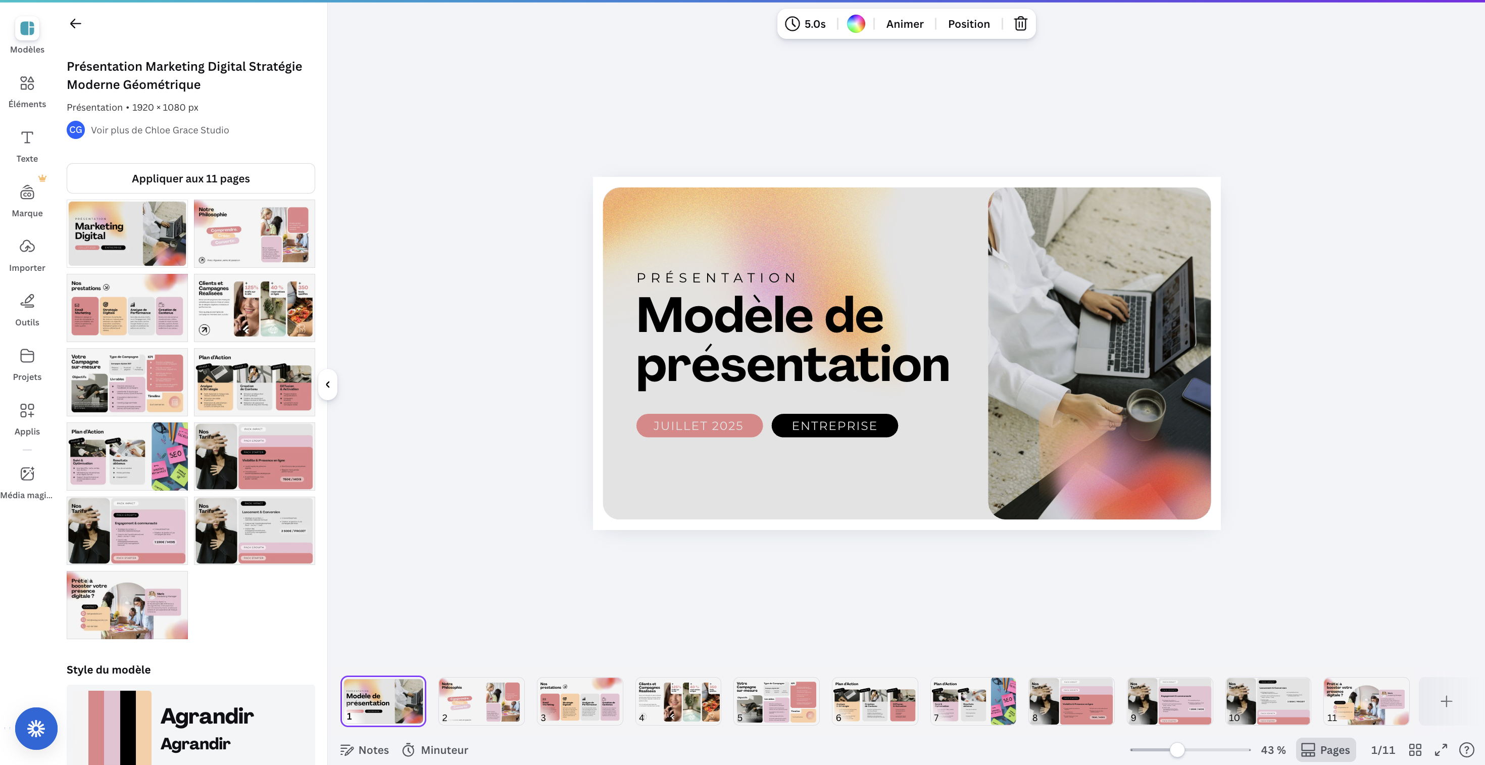 Le kit de marque (en formule Pro) permet d’appliquer automatiquement votre identité visuelle sur chaque design pour un rendu cohérent sur tous vos supports de communication.