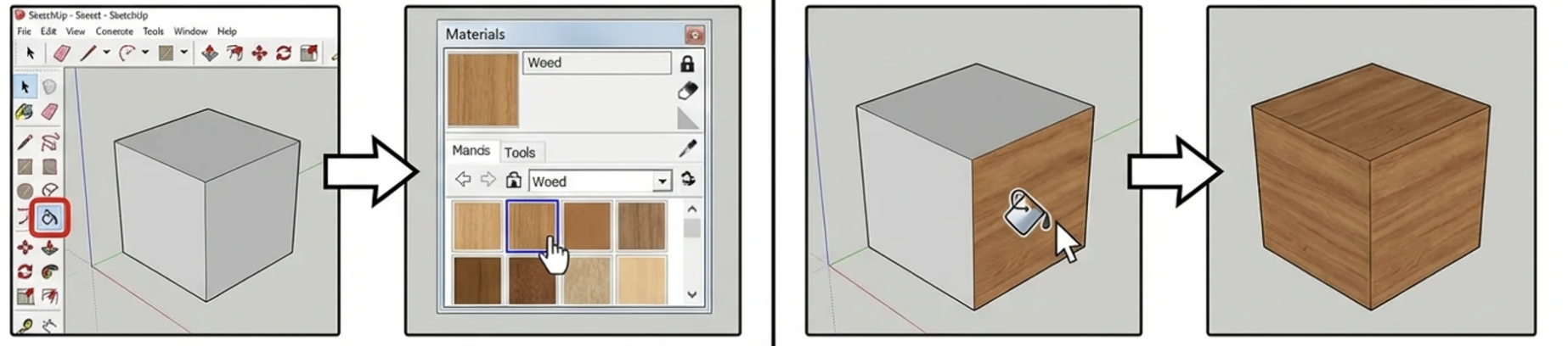 Astuce : maintenir Maj pendant l’application remplace toutes les surfaces du modèle qui utilisent déjà ce même matériau par le nouveau matériau sélectionné. Par exemple, si plusieurs surfaces utilisent déjà le même bois clair, SketchUp peut le remplacer partout par un bois plus foncé en un seul clic.